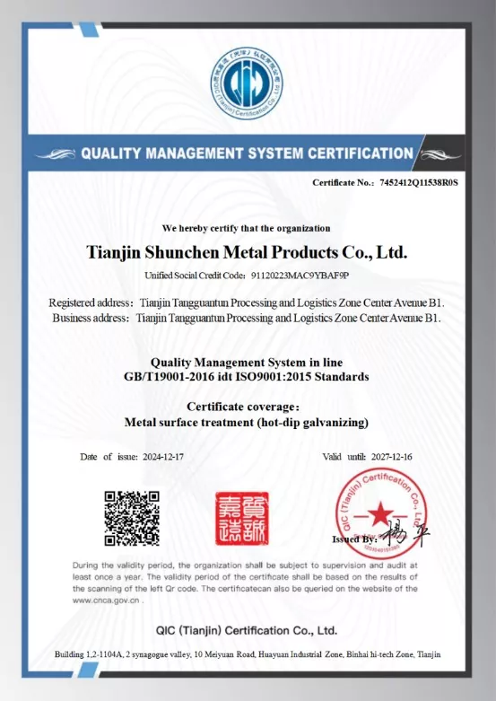 Tianjin Shunchen може да се пофали со долгогодишно искуство во производството, со производствена линија што го опфаќа целиот синџир на индустријата. Компанијата поседува сертификат за систем за управување со квалитет ISO 9000, кредитна сертификација 3А и CE сертификат од ЕУ, поставувајќи цврста основа за квалитет. Преку дванаесет ригорозни процесни текови и тристепениот сеопфатен механизам за инспекција, компанијата постигна рекорд од нула годишен квалитет и безбедност на несреќи. Во текот на изминатите дванаесет години, имаше нула прекршување на договорот при испорака на нарачки, што покажува високо ниво на доверливост. Интегрираниот модел на производство и продажба, заедно со складишен капацитет од 10.000 метри квадратни, им обезбедува на клиентите услуги за набавки едношалтерски. Системот за поддршка по продажбата го покрива целиот циклус, нудејќи одговор 24/7. Нарачките може да се следат во реално време преку осумнаесет јазли, обезбедувајќи транспарентен и контролиран процес.